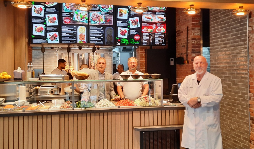 Bircan Taşkınlar (sağda), Akın Şengül (solda ceketli) ve ekip arkadaşları, Hamburg Stellinger Höfe’deki yeni Ramiz Köfte & Döner şubesinde. Türkiye’nin 97 yıllık köfte markası, artık Almanya’da da lezzet severlerle buluşuyor.