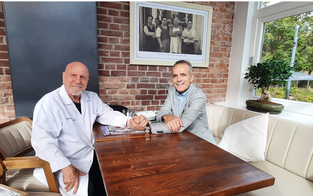 Bircan Taşkınlar (solda) ve Akın Şengül (sağda), Hamburg Stellinger Höf’de açılan Ramiz Köfte’nin ilk Almanya şubesinde bir araya geldi. Arka plandaki fotoğraf, markanın kurucusu Ramiz Taşkışla ve 1948’li yıllardaki Akhisar’daki ilk dükkân çalışanlarını gösteriyor.