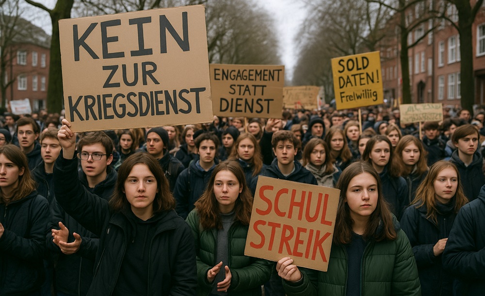 Forsa’nın yaptığı son ankete göre 18–29 yaş arası gençlerin yüzde 63’ü zorunlu askerliği reddediyor. Bu durumun yarattığı tepki üzerine öğrenciler Cuma günü için ülke çapında okul grevi çağrısı yaptı. Hamburg’da da geniş katılımlı bir protesto bekleniyor. Sol Partinin gençlik örgütü Linksjugend [’solid] ile Sol Parti Hamburg teşkilatı da öğrencilerin bu protestosuna açık destek verdiklerini açıkladı.