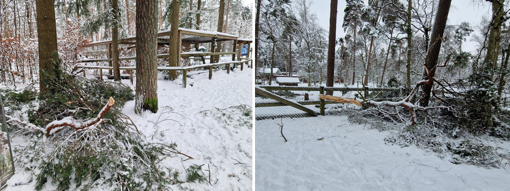 Altona Belediyesi, yoğun kar yağışı nedeniyle oluşan ağaç ve dal kırılmaları sebebiyle Klövensteen Yaban Hayatı Parkı’nı süresiz olarak kapattı. Ziyaretçilere ormanlık alanlardan uzak durmaları çağrısı yapıldı. Foto:Bezirksamt Altona