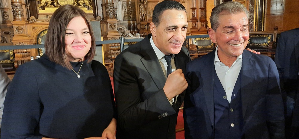 Foto: Soldan sağa – Hamburg İkinci Belediye Başkanı Katharina Fegebank, boksör İsmail Özen ve hukukçu-yazar Michel Friedman, Hamburg Yeşilleri’nin Belediye Sarayı’nda düzenlediği yeni yıl resepsiyonunda.