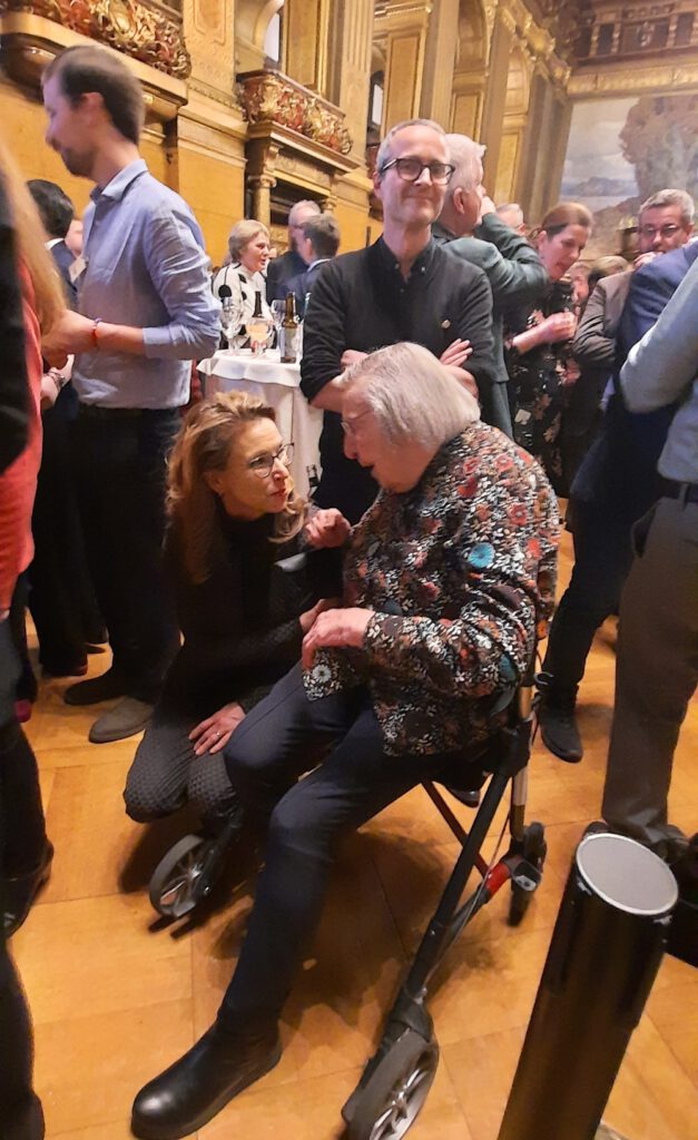 Foto: Hamburg Eyalet Parlamento Başkanı Carola Veit, resepsiyonda tekerlekli sandalyede etkinliği izleyen yaşlı bir Alman kadınla yere inerek sohbet ediyor.