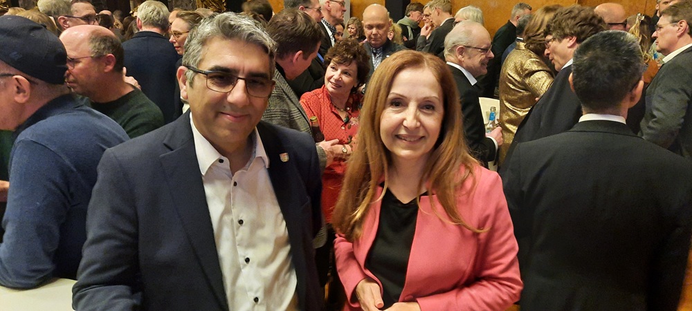 Foto: Solda – Hamburg Türk Toplumu Başkanı Murat Kaplan ve Yeşiller Hamburg Eyalet Milletvekili Filiz Demirel, Hamburg Yeşilleri’nin Belediye Sarayı’nda düzenlediği yeni yıl resepsiyonunda.