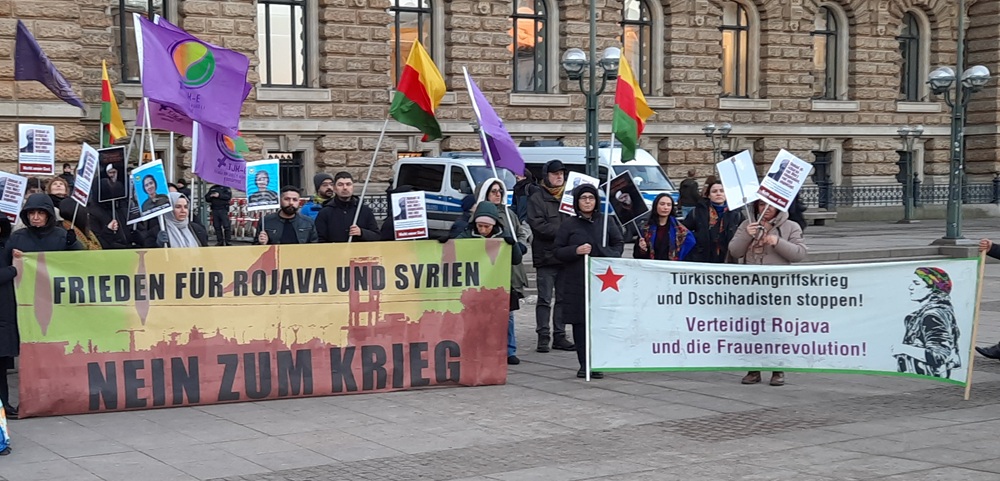 Gösteri, Almanca, Kürtçe ve Türkçe yapılan konuşmalarla Rojava ve Suriye’deki saldırıların kınanması, Kürt bölgelerine yönelik şiddetin durdurulması ve barışın sağlanması çağrısı yapıldı.