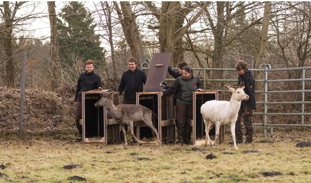 Hirschpark’ta yaşayan son üç alageyik, hayvan refahı gerekçesiyle Klövensteen’e nakledildi. Yetkililer taşımanın sorunsuz gerçekleştiğini açıklarken, karar kamuoyunda tartışmalara neden oldu. Foto: Bezirksamt Altona
