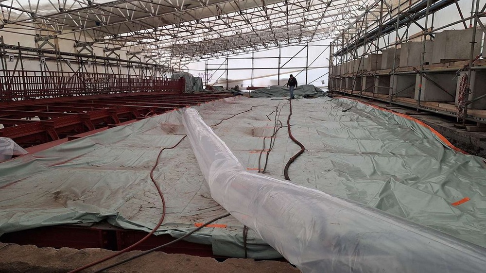 Wartenaubrücke’de üstü kapatılmış şantiye alanı: Güçlendirilen ve yeniden kaplanan çelik konstrüksiyon açığa çıkarıldı; şu anda korunarak kapatılmış durumda ve yeni yol plakası betonunun dökülmesi için hazır hale getirildi. Foto: LSBG
