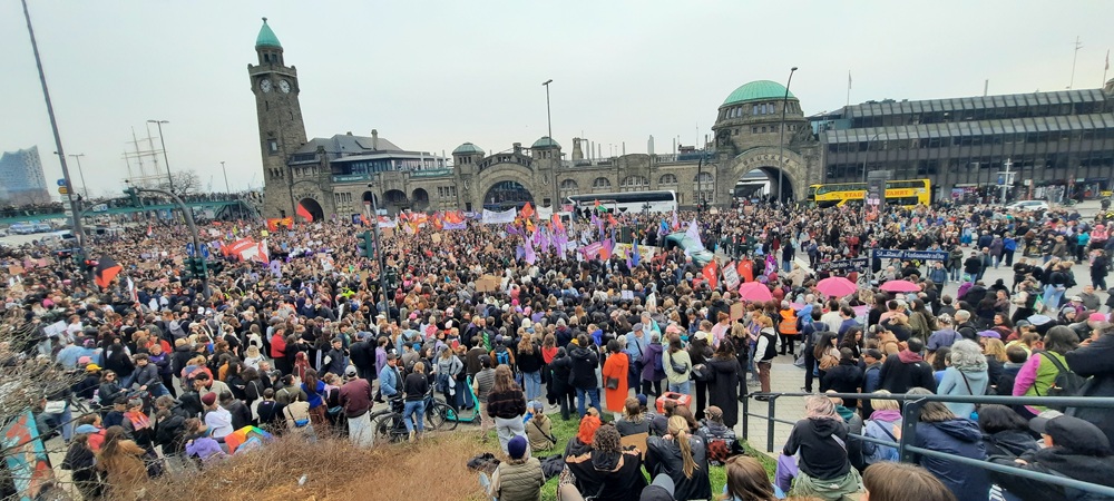 HamburgHaber – Uluslararası Kadınlar Günü dolayısıyla Hamburg’da binlerce kişi sokaklara çıkarak kadın hakları, eşit ücret ve şiddete karşı daha güçlü önlemler talebiyle yürüdü. Kentte gün boyunca çeşitli etkinlikler ve gösteriler düzenlenirken, en büyük yürüyüş St. Pauli’deki Landungsbrücken’de başladı ve şehir merkezine doğru ilerledi.