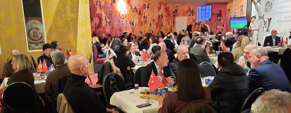 Hamburg’da uzun yıllardır faaliyet gösteren Galatasaray Taraftarlar Derneği, Ramazan ayı dolayısıyla dernek lokalinde geniş katılımlı bir iftar organizasyonu gerçekleştirdi. Programa, T.C. Hamburg Başkonsolosluğu Eğitim Ataşesi Mustafa Ekinci, SPD Hamburg Eyalet Milletvekilleri Mithat Çapar, Sören Platten ve Oktay Özdemir, Hamburg ve Çevresi Türk Toplumu Başkanı Murat Kaplan, Türk Hava Yolları Hamburg ve Hannover Bölge Müdürü Mehmet Ali Söylet, CHP Hamburg Birliği Başkanı Hulisi Işıtan, eğitimci-pedagog ve aile danışmanı Sümmeye Betül Lambrecht, iş insanları, STK temsilcileri ve dernek üyeleri katıldı.