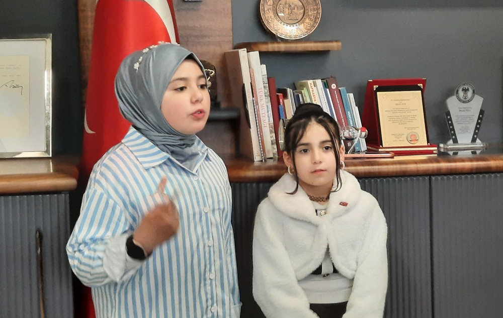 Azra ve kardeşi Yüsra, İstiklal Marşı’nın 10 kıtasını ezbere okumaya başladığında, zaman adeta yavaşladı. Her kıta, sadece bir şiir değil; bir hafıza, bir bağ ve bir kimlik gibi yankılandı salonda. Bazı gözler doldu, bazı başlar öne eğildi.