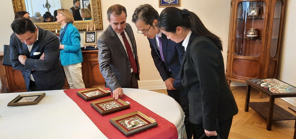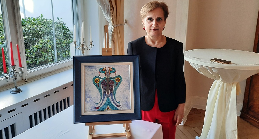 Ticaret Ataşesi Yıldız Onur, çini sanatçısı Elif Alver’e çiçek takdim ederek sergi dolayısıyla tebrik etti.